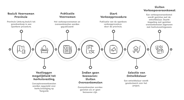 Op korte termijn wordt ook de volgende stap gezet, te weten de publicatie van de start van de verkoopprocedure voor de locatie Tangveld. Gekozen is om de locatie Tangveld door Provincie Limburg met de huidige agrarische bestemming (zoals het er nu bij ligt) te verkopen aan een ontwikkelaar.