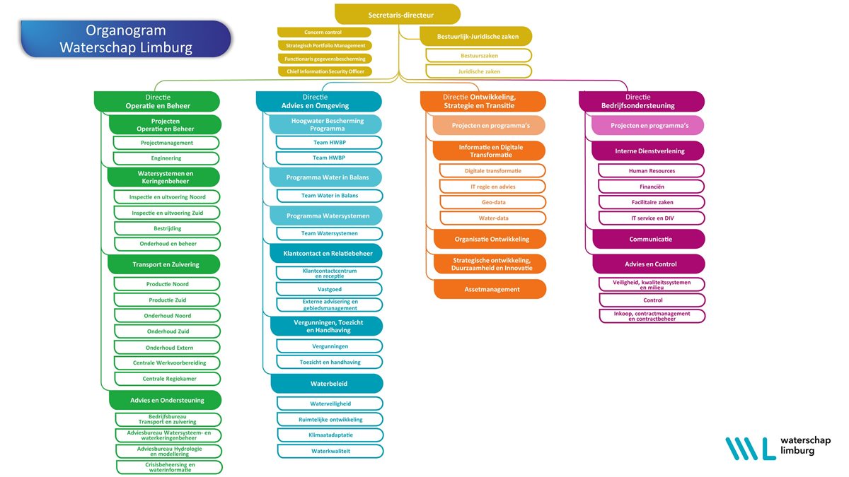 Waterschap Limburg bestaat uit een algemeen en dagelijks bestuur én een uitvoerende organisatie. De uitvoerende organisatie bestaat uit een directie, diverse afdelingen met teams en programma’s.