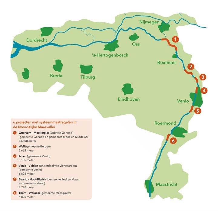 Waterschap Limburg werkt in de Noordelijke Maasvallei op 16 locaties samen met het Rijk, provincie en gemeenten aan sterke dijken. Naast het versterken en verhogen van dijken is op zes locaties het verleggen van dijken verkend, om de Maas meer ruimte te geven.